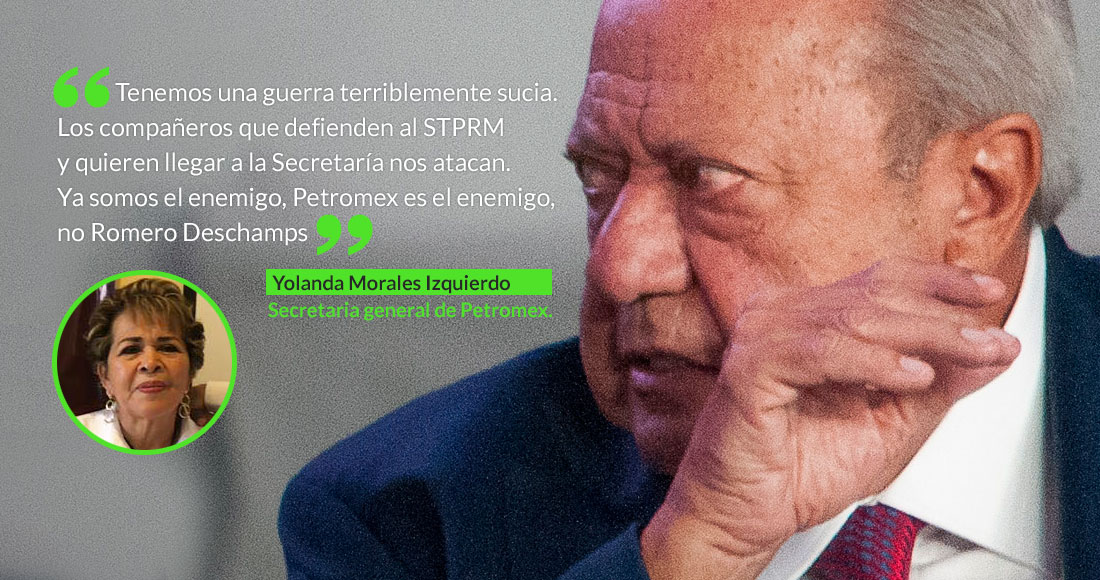 "Tenemos una guerra terriblemente sucia. Los compañeros que defienden al STPRM y quieren llegar a la Secretaría nos atacan. Ya somos el enemigo, Petromex es el enemigo, no Romero Deschamps", aseguró en entrevista Yolanda Morales Izquierdo, Secretaria general de Petromex.