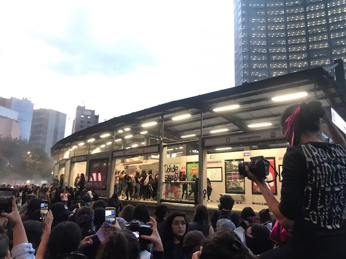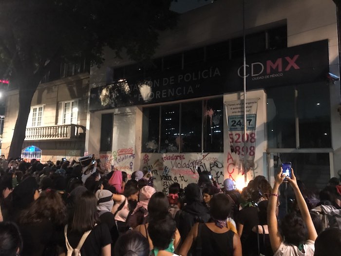 Fue después de las 18:00 horas que la protesta cambió de tono: algunas mujeres realizaron pintas y destrozos en las inmediaciones de la Glorieta de los Insurgentes que dejaron daños la estación del Metrobús, donde también se prendió fuego. Posteriormente incendiaron la estación de Policía Florencia, ubicada a unos metros de distancia. Algunas asistentes escribieron consignas de denuncia, y luego rompieron los cristales y mobiliario.