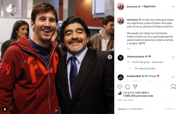 "Nos deja pero no se va, porque el Diego es eterno. Me quedo con todos los momentos lindos vividos con él y quería aprovechar para enviarle el pésame a toda su familia y amigos. QEPD (Que En Paz Descanse)", dijo Messi.