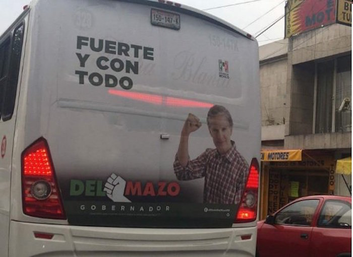 La candidatura del priista Alfredo del Mazo Maza es promovida en combis, taxis y camiones en el Estado de México desde hace unos días. “Vamos con Del Mazo”, “Unidos con Del Mazo”, “En apoyo Alfredo del Mazo a la gubernatura” y “Fuerte y con todo”, son algunas de las leyendas que fueron colocadas en los vidrios de las unidades del transporte público.