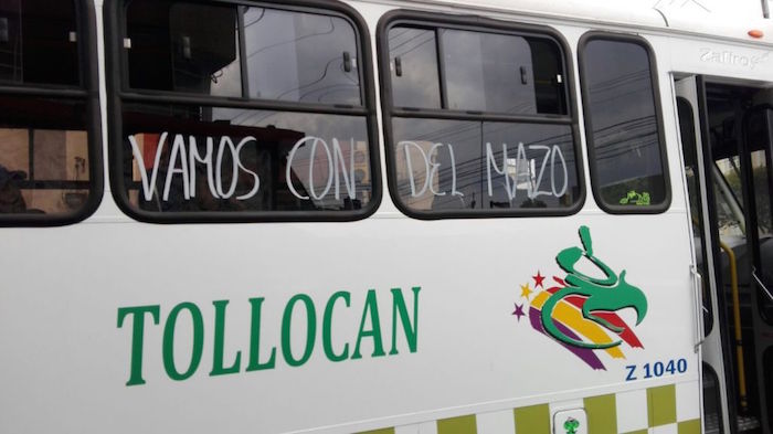 “Vamos con Del Mazo”, “Unidos con Del Mazo”, “En apoyo Alfredo del Mazo a la gubernatura” y “Fuerte y con todo”, son algunas de las leyendas que través de redes sociales denuncian se pueden leer en los vidrios de los autobuses.
