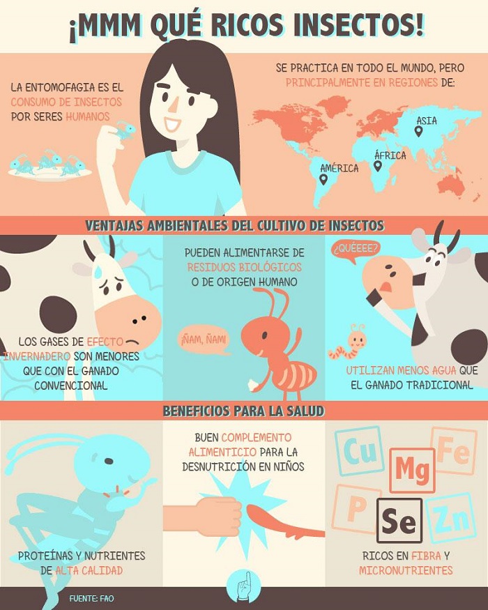 De acuerdo con un informe de la Organización de las Naciones Unidas para la Alimentación y la Agricultura (FAO) el consumo de insectos por seres humanos recibe el nombre de entomofagia y se practica en muchos países pero principalmente en las regiones de América Latina, Asia y África. "La ingesta de insectos complementa la dieta de aproximadamente 2 mil millones de personas, y se trata de un hábito que siempre ha estado presente en la conducta alimentaria de los seres humanos", se lee en el texto de la FAO titulado La contribución de los insectos a la seguridad alimentaria, los medios de vida y el medio ambiente.