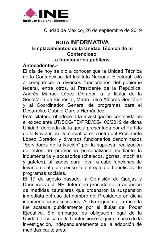 Con la denuncia de "pruebas y alegatos", presentada por el partido "del sol azteca", el árbitro electoral requirió al tabasqueño por el caso de los "Servidores de la Nación". Dicho requerimiento fue firmado por el titular de la Unidad Técnica de lo Contencioso Electoral de la Secretaría Ejecutiva del INE, Carlos Alberto Ferrer Silva.