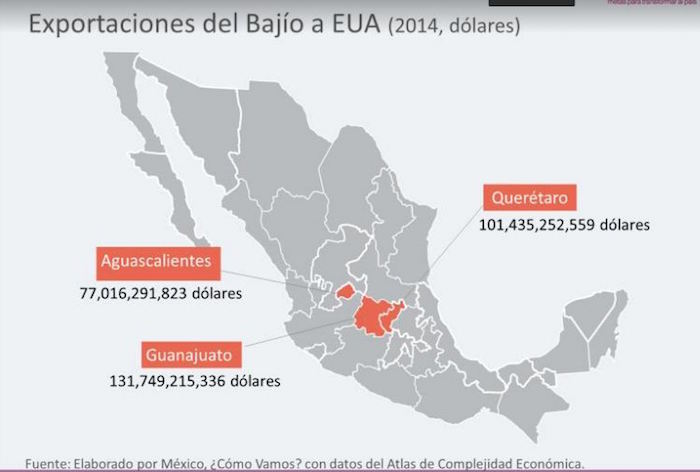 Según una investigación de la asociación México Cómo Vamos, Guanajuato es el estado del centro del país que más exporta hacia Estados Unidos con un 73.2 por ciento de sus productos, y sólo lo superan entidades fronterizas como Chihuahua, Baja California y Sonora, en donde más del 80 por ciento de sus mercancías se dirigen a aquel país.