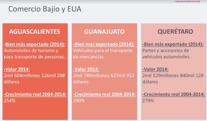 Este mismo reporte menciona que el crecimiento real en las exportaciones que Guanajuato ha hecho a Estados Unidos es del 290 por ciento desde el año 2004 hasta el 2014.