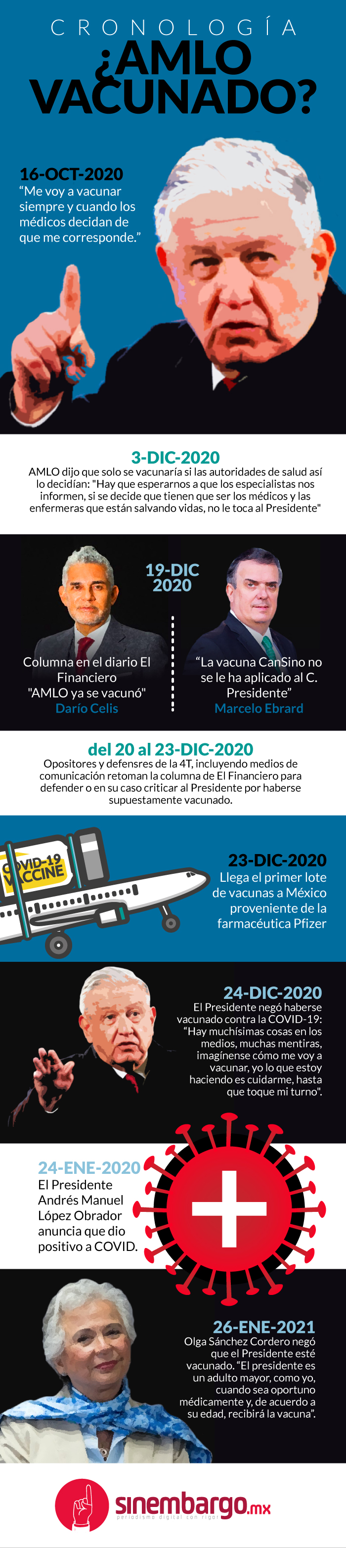 Al día de hoy, López Obrador y su equipo de trabajo sostienen que el Presidente no se ha vacunado, incluso el Ejecutivo federal se contagió de COVID y anunció que dio salió positivo el pasado 24 de enero. El actual Gobierno sostiene –a pesar de las excepciones– que no hay influyentismo y que las irregularidades serán castigadas porque “es inmoral el saltarse o brincarse la fila”.