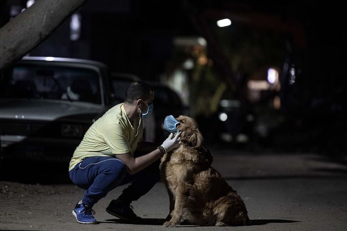 Un hombre pone una mascarilla a su perro en El Cairo, Egipto, este 12 de abril. Aunque el patógeno provenga de animales, los perros son muy poco propensos al contagio, según han concluido investigadores del Laboratorio de biotecnología veterinaria y el Centro de contención, control y prevención de enfermedades en animales de China. En el país asiático, según cuenta el periodista Zigor Aldama, en un inicio se abandonaron e incluso asesinaron mascotas ante el temor de que pudieran transmitir la enfermedad.