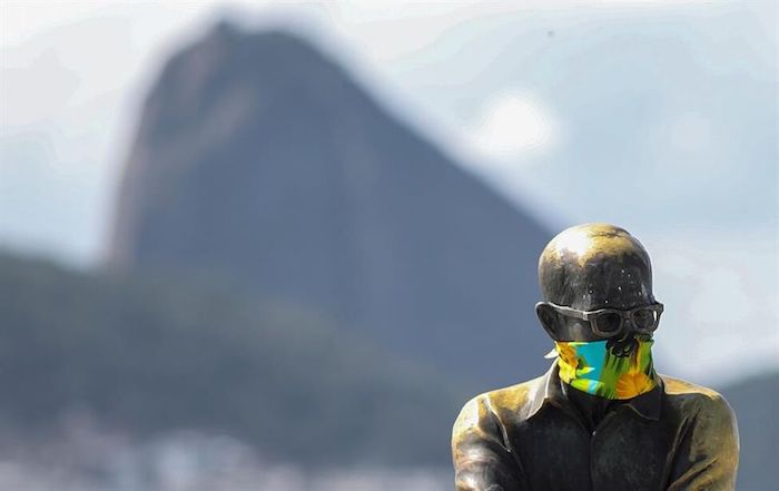 Vista de la escultura del poeta Carlos Drummond de Andrade y del cantautor brasileño Dorival Caymino con mascarillas este 23 de abril, en Río de Janeiro. El jueves, el Ayuntamiento puso mascarilla a estas estatuas, así como a la del capitán de la mítica selección brasileña de 1958 Hilderaldo Bellini y el cantante Cartola para concienciar a los brasileños sobre el uso de mascarillas, que ha comenzado a a ser obligatorio en la ciudad.