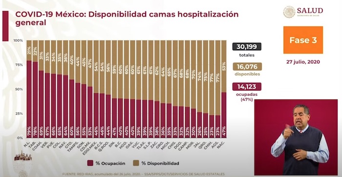 En cuanto a la ocupación hospitalaria general, esta se ubica en 47 por ciento. De las 30 mil 199 disponibles, 14 mil 123 cuentan con algún paciente.
