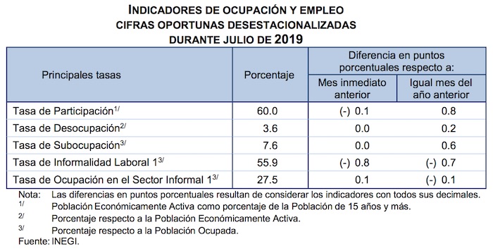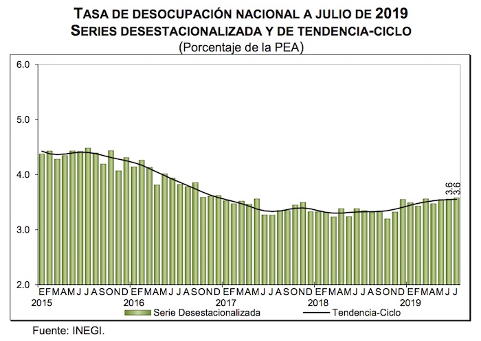 Según datos ajustados por estacionalidad, el nivel de desempleo se situó en 3.6 por ciento en el séptimo mes del año, una tasa idéntica a la registrada en junio pasado, indicó la institución en un comunicado.