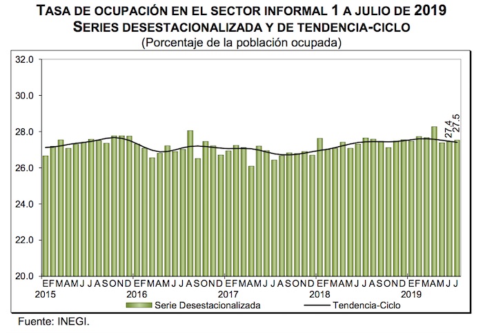 Las personas en la economía informal representaron el 56.3 por ciento del total de la población ocupada, por debajo del 56.9 que había en el mismo mes de 2018.