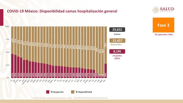En cuanto a la ocupación hospitalaria, la media nacional se ubica en el 27 por ciento. De los 28 mil 926 espacios disponibles, 7 mil 832 tienen un paciente.