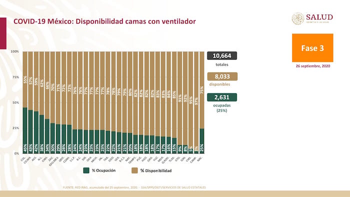 Sobre los espacios con ventilador, la media nacional es del 23 por ciento. De los 10 mil 283 espacios disponibles, 2 mil 385 tienen un paciente con apoyo respiratorio.