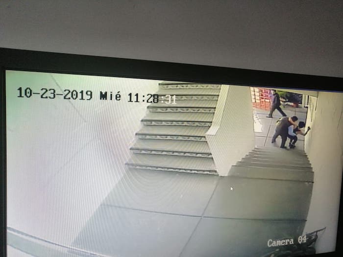 En la segunda imagen, se aprecia el momento en que el hombre y Blanca Saraí están justo en una de las salidas de la institución educativa, cuyas rejas son de color rojo. Justo en la parte de arriba de donde ambos se encuentran de pie, se lee "Emergencia".