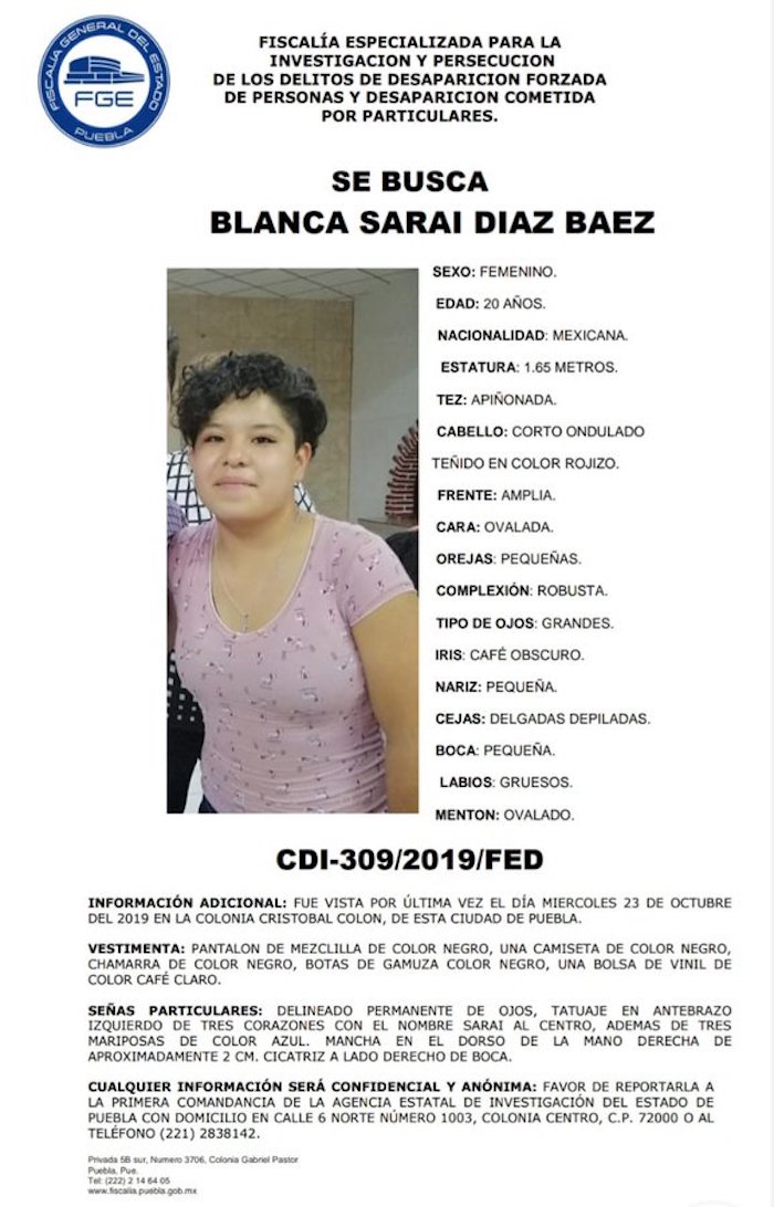 Ciudad de México, 27 de octubre (SinEmbargo).– Blanca Saraí Díaz Báez, de 20 años de edad, desapareció el miércoles 23 de octubre en la capital poblana. Hasta el momento no se ha sabido nada de ella, pero desde ese día, sus familiares y amigos comenzaron a difundir su fotografía en redes sociales para tratar de localizarla.