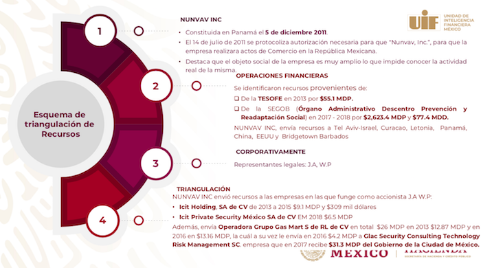 Durante la presentación del informe de labores de la Unidad que encabeza, recordó que la empresa Nunvav INC, usada por el ex funcionario supuestamente para triangular recursos, envía dinero a Tel Aviv-Isarael, Curacao, Letonia, Panamá, China, Estados Unidos y Bridgetown Barbados.
