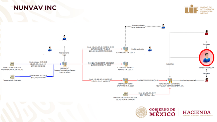 Mientras que la segunda se trató de la creación de la empresa en 2011 en Panamá. "Esta empresa Nunvav INC, después, durante el siguiente sexenio [de Enrique Peña Nieto] recibe recursos por parte de varias dependencias del Estado mexicano, entre ellas, la Segob", añadió.