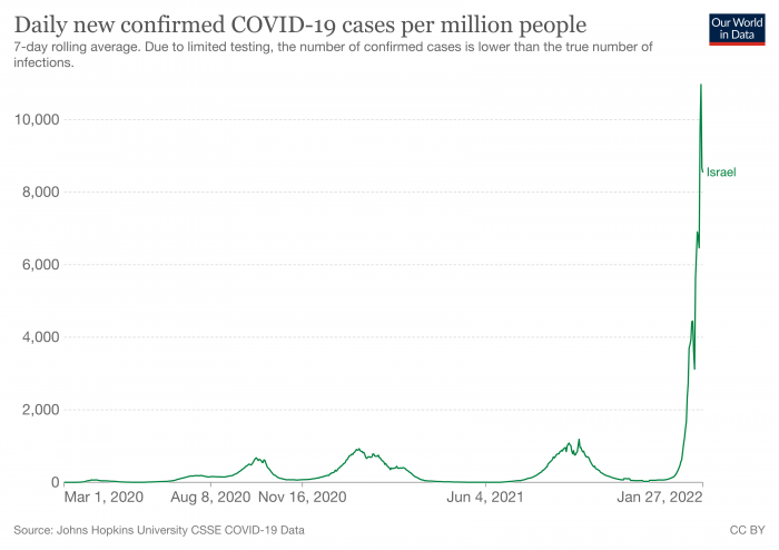 Israel ha liderado los contagios per cápita en el mundo en esta ola de Ómicron y el ratio de positividad se mantiene en torno al 25 por ciento aunque el de reproducción ha bajado hasta el 1.02.