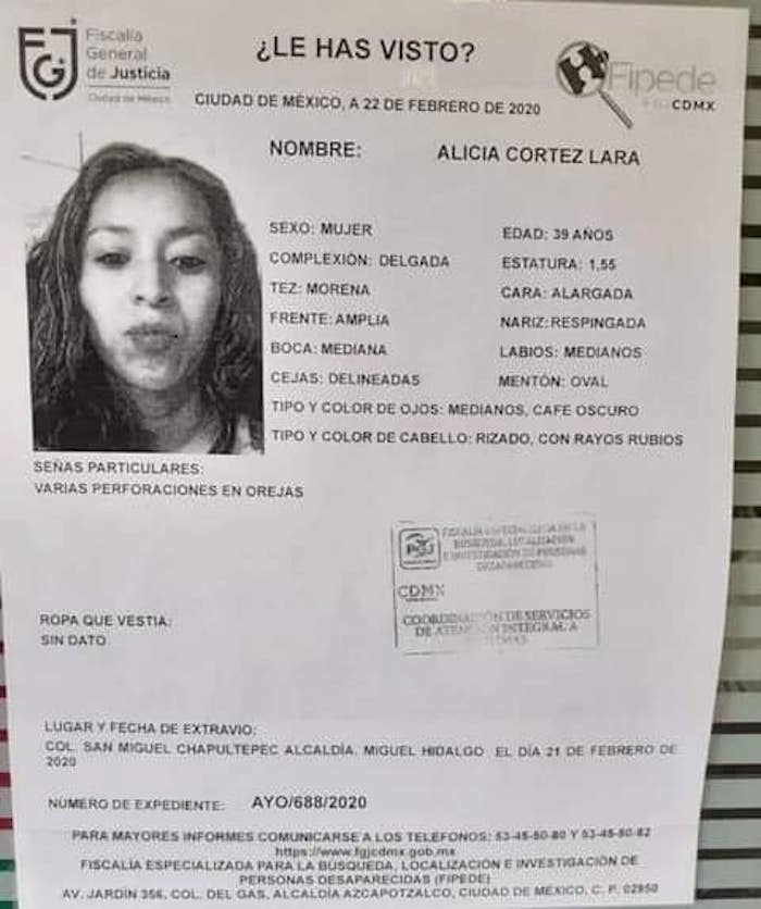 La Fiscalía General de Justicia de la Ciudad de México informó hoy que una de las mujeres, identificada como Alicia Cortés Lara, de 39 años de edad, salió de su domicilio ubicado en la Alcaldía Gustavo A. Madero el 21 de febrero, y no se supo más de ella.