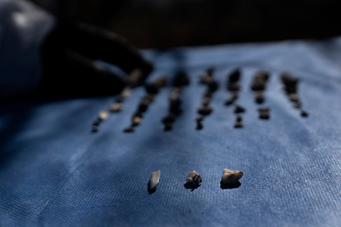 En la jornada 40 de trabajo en el sitio de Nuevo Laredo manos enguantadas van cribando la tierra y separando los restos humanos que encuentran: un trozo de mandíbula, fragmentos de cráneo, una vértebra.