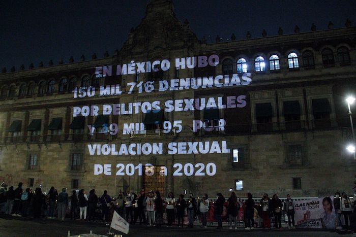 La exhibición, que durará toda la noche, contempla proyecciones en Palacio Nacional con mensajes al Gobierno de México y a la comunidad internacional, además de los nombres de víctimas de feminicidios.
