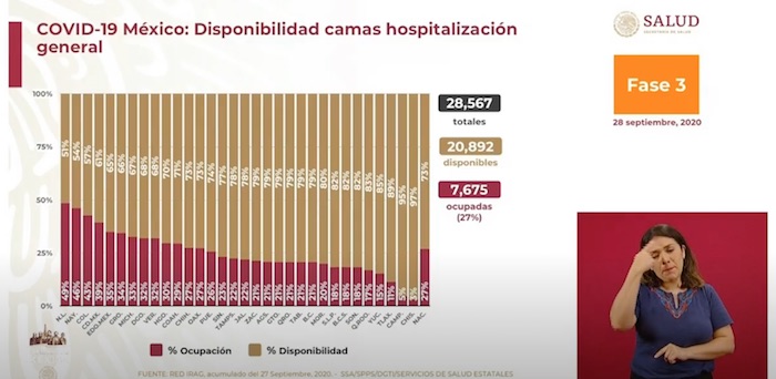 Para el caso de la hospitalización, la media se ubica en el 27 por ciento. De los 28 mil 567 espacios disponibles, 7 mil 675 están ocupados.