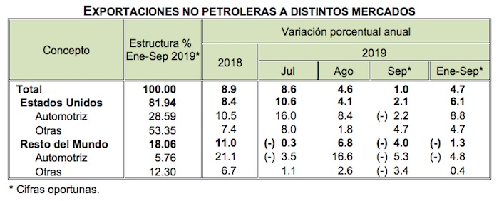 Y apuntó que, al interior de las exportaciones no petroleras, las dirigidas a Estados Unidos avanzaron 2.1 por ciento a tasa anual, en tanto que las canalizadas al resto del mundo retrocedieron 4 puntos porcentuales.