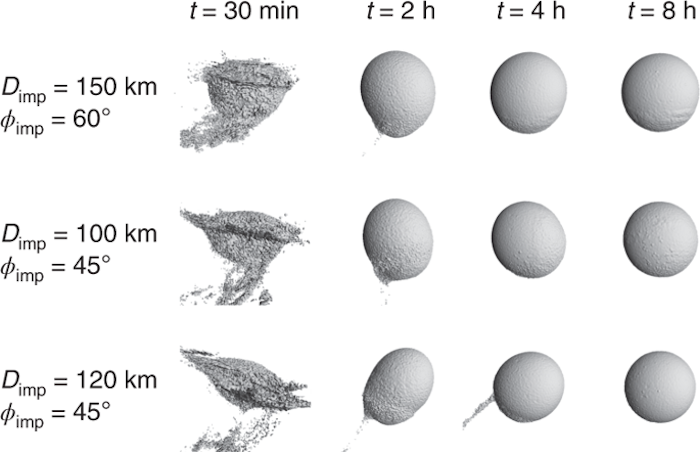 El equipo decidió investigar más a fondo. Utilizando simulaciones numéricas, dedujeron que la forma esférica de Hygiea y la gran familia de asteroides son probablemente el resultado de una gran colisión frontal con un gran proyectil de diámetro entre 75 y 150 km. Sus simulaciones muestran que este impacto violento, que se cree que ocurrió hace unos dos mil millones de años, destrozó por completo el cuerpo de los padres.