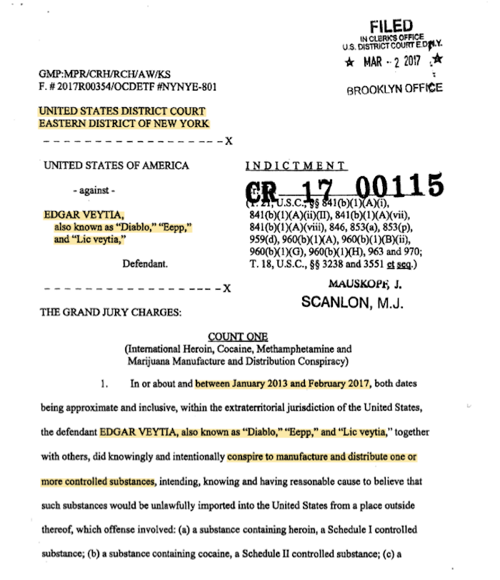 Ciudad de México, 29 de marzo (Univisión).– Tráfico internacional de heroína, cocaína, metanfetaminas, fabricación de marihuana y conspiración para distribuir estas drogas entre enero de 2013 y febrero de 2017 son los cargos que enfrentará el polémico Fiscal General de Nayarit, Edgar Veytia, en la Corte del Distrito Este de Nueva York, según documentos públicos obtenidos por Univision Investiga.