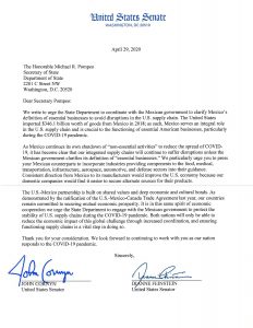 Ciudad de México, 29 de abril (SinEmbargo).- Un grupo de al menos 10 senadores de Estados Unidos solicitaron al Secretario de Estado de ese país, Mike Pompeo, aclarar con el Gobierno de México la definición de empresas esenciales, con el objetivo de evitar interrupciones en la cadena de suministro entre ambos países.