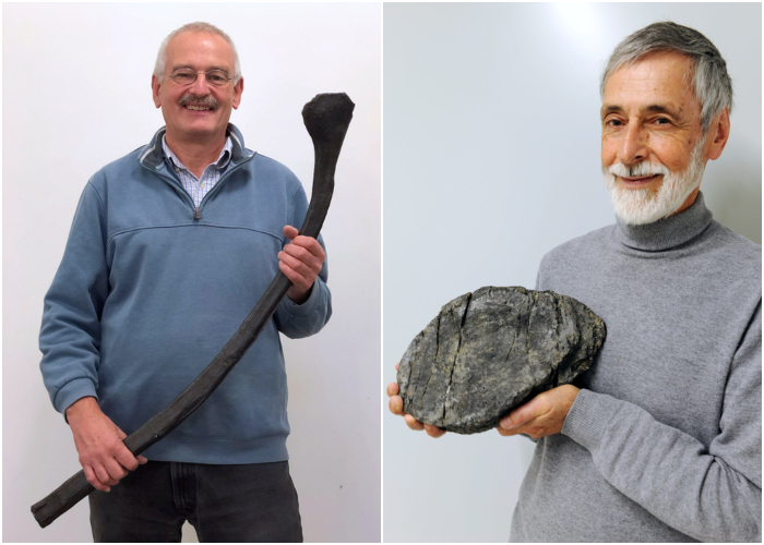Investigadores sostienen una costilla (izquierda) y una de las mayores vértebras (derecha) del ictiosaurio. Fotos: Laurent Garbay/University of Bonn y Rosi Roth/University of Zurich
