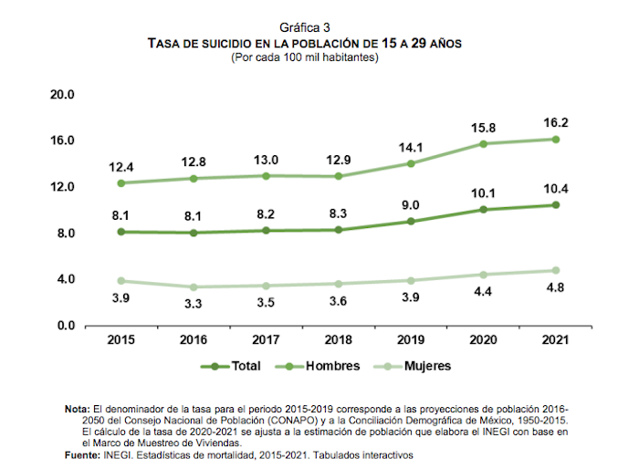 Además, subrayó, en general hubo un aumento del suicido en este rango de edad, hombres y mujeres, en los últimos años, ya que en 2015, se “estimó una tasa de 8.1 muertes por lesiones autoinfligidas por cada 100 mil personas”, mientras que en “2021, la tasa de suicidios para el mismo grupo fue de 10.4 por cada 100 mil personas”.