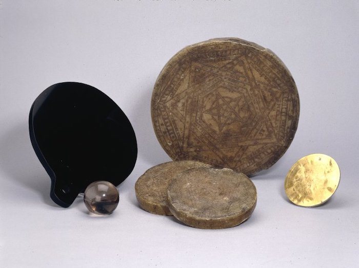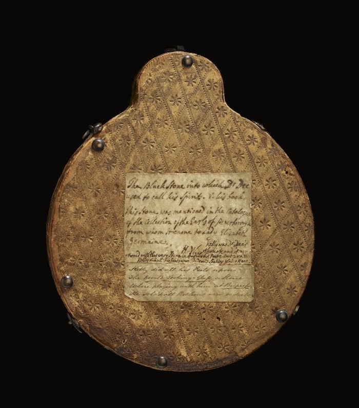 Nearby are Dr John Dee's magical tools. Dee was an Elizabethan mystic who lived in Mortlake. The obsidian mirror was used for summoning spirits -- here it reflects your Londonist correspondent. 3/17 pic.twitter.com/91AhCnRx8c