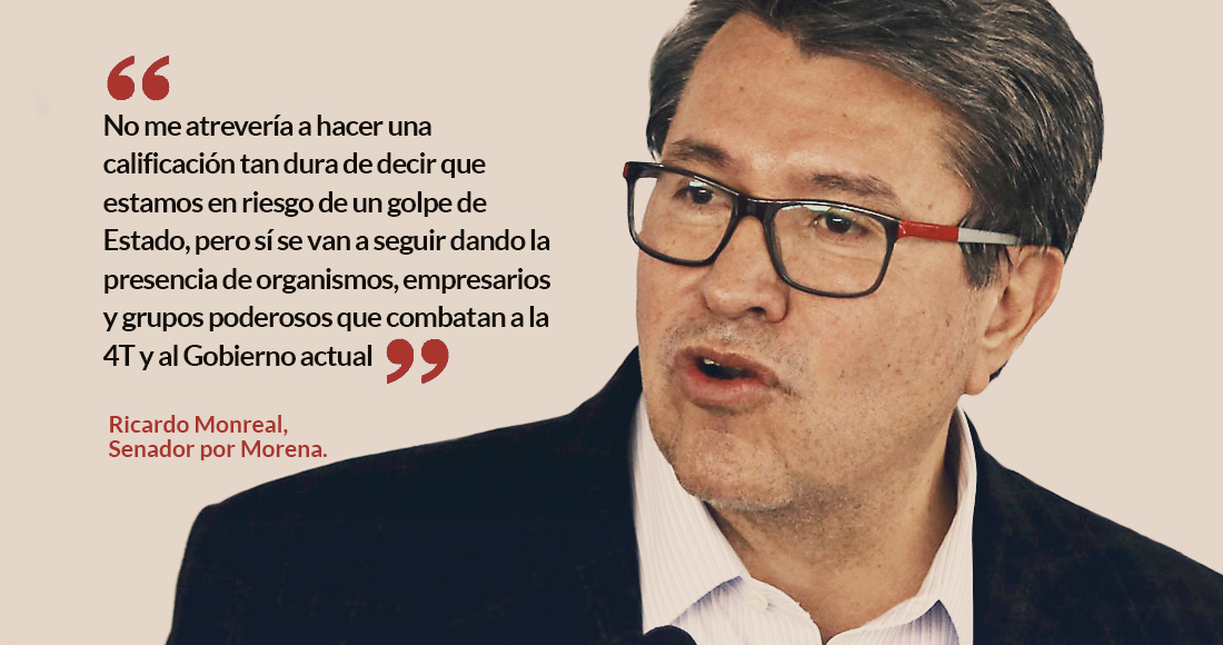 “Yo no me atrevería a hacer una calificación tan dura de decir que estamos en riesgo de un golpe de Estado. Creo que la población está muy madura para aceptar, permitir, que eso se dé. No se va a dar, pero sí se va a seguir dando la presencia de organismos económicos, empresarios y grupo poderosos que combatan a la 4T, que combatan al Gobierno actual. Tan lo es, que a pesar de que concluyó el proceso electoral, la embestida mediática, la crítica permanente contra el Presidente y sus programas o contra la 4T sigue presente, no ha disminuido, sigue muy fuerte en sectores económicos, en sectores intelectuales, en sectores de comunicación y en sectores sociales”, planteó Monreal.