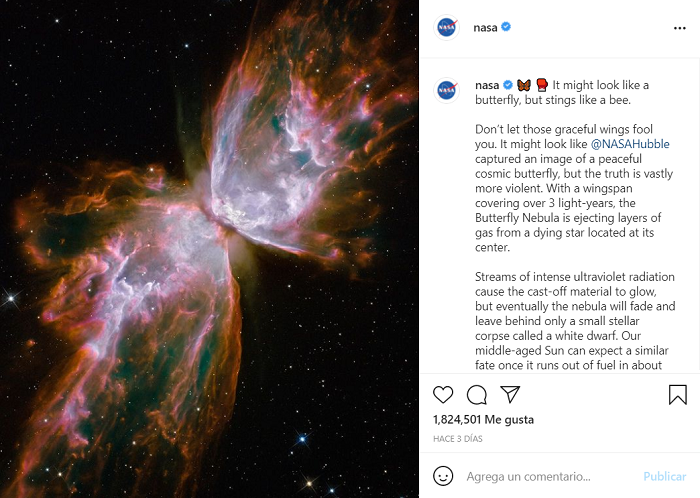 "Puede parecer una mariposa, pero pica como una abeja. No dejes que esas elegantes alas te engañen. Puede parecer que el Hubble captó una imagen de una pacífica mariposa cósmica, pero la verdad es mucho más violenta", publicó la NASA en su cuenta oficial de Instagram.