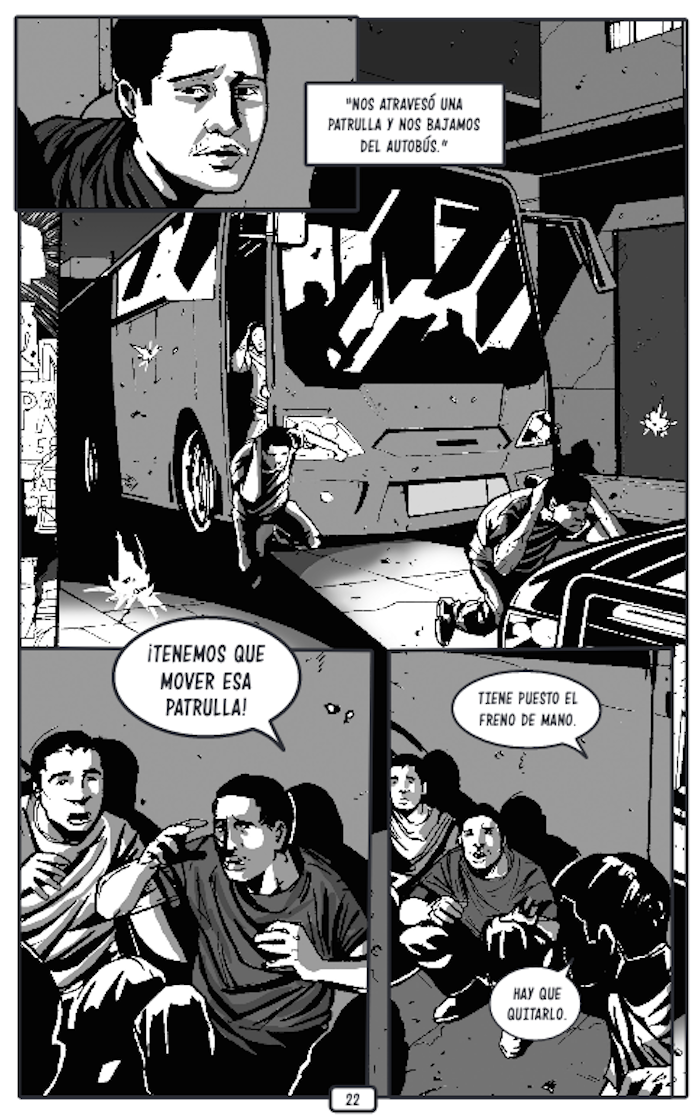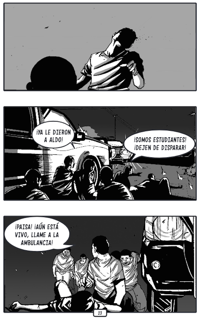 Si es difícil entrevistar a víctimas de violencia, lo es más cuando el propósito es una novela gráfica documental. Ernesto me contó cómo vio a su amigo Aldo caer frente a él, después de recibir una bala en la cabeza y cómo tuvo que ir a declarar frente al fiscal, quien lo acusó de ¡haber atacado a los policías que balearon a Aldo! En esa conversación le pregunté cuántos años tenía el fiscal, si era gordo, flaco, si tenía bigote. Estos detalles pueden parecer absurdos cuando estás hablando con alguien que apenas sobrevivió en esa noche de terror, pero son preguntas necesarias si quieres que tus imágenes sean lo más apegadas a la realidad.
