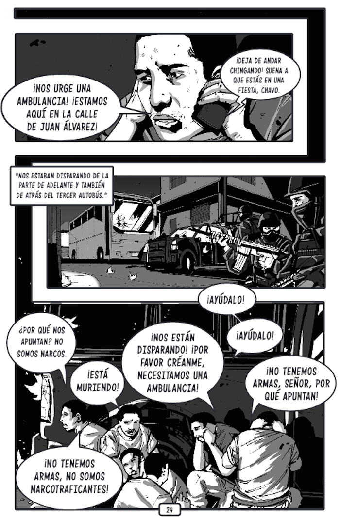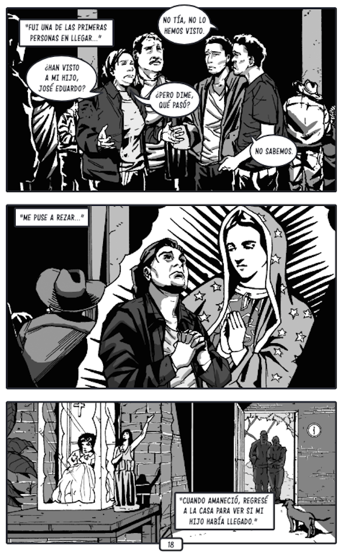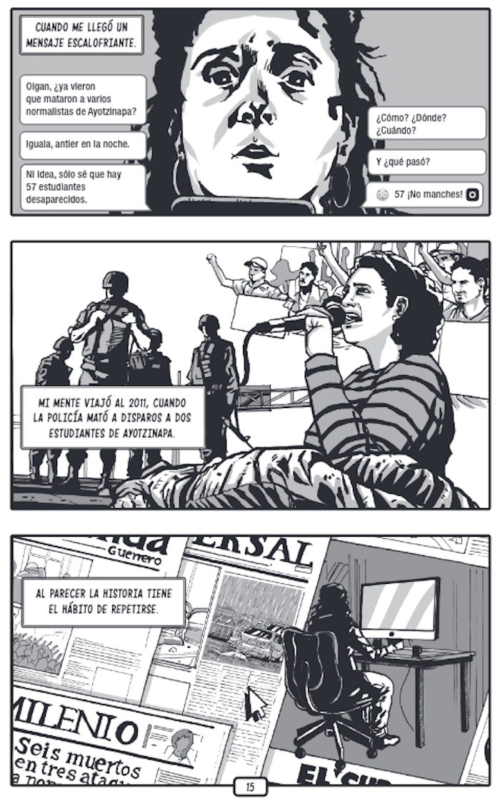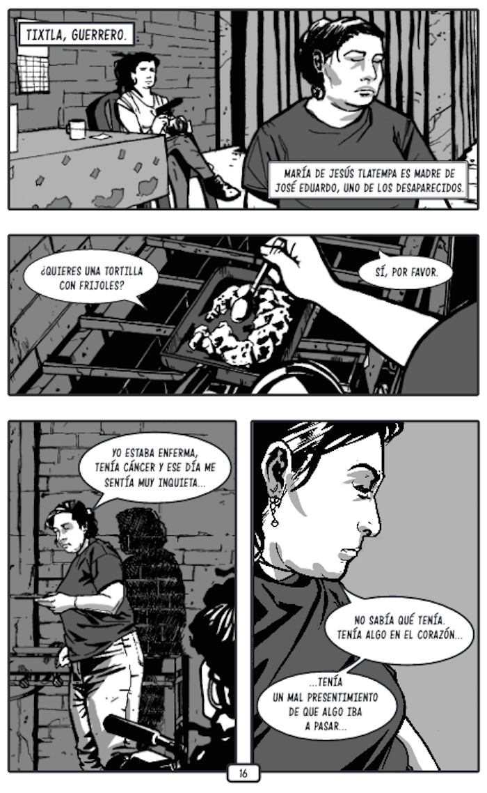 Fue hasta que imprimí un capítulo y le di una copia a doña Minerva Bello, mamá del estudiante desaparecido Everardo Rodríguez, y después de comentarme que le gustó mucho porque sólo había estudiado hasta la secundaria y le costaba mucho leer textos, que los dibujos le ayudaban a entender la historia; me di cuenta de que este libro sí tenía audiencia en México, aun en lugares donde el analfabetismo prevalece y el internet no ha llegado. Doña Minerva, lamentablemente, falleció; la angustia venció su cuerpo, pero su aprecio por la narrativa gráfica siempre quedará grabada en mi mente, el compartir con ella los inicios de este proyecto, en gran parte, es resultado de que esta obra esté en tus manos.