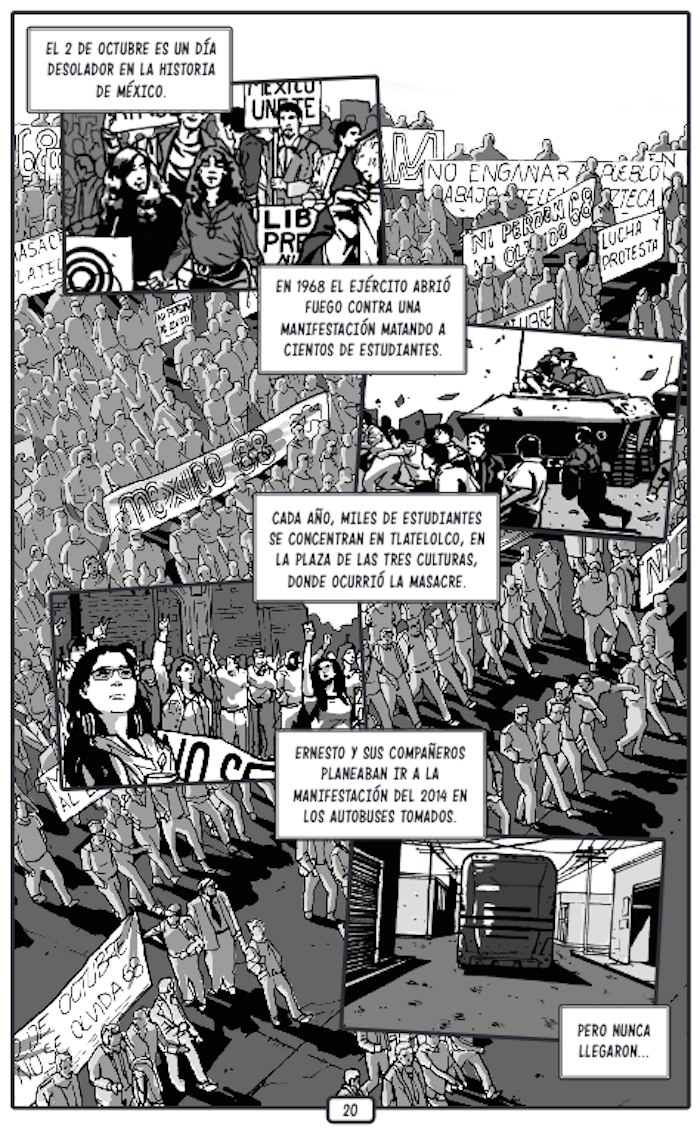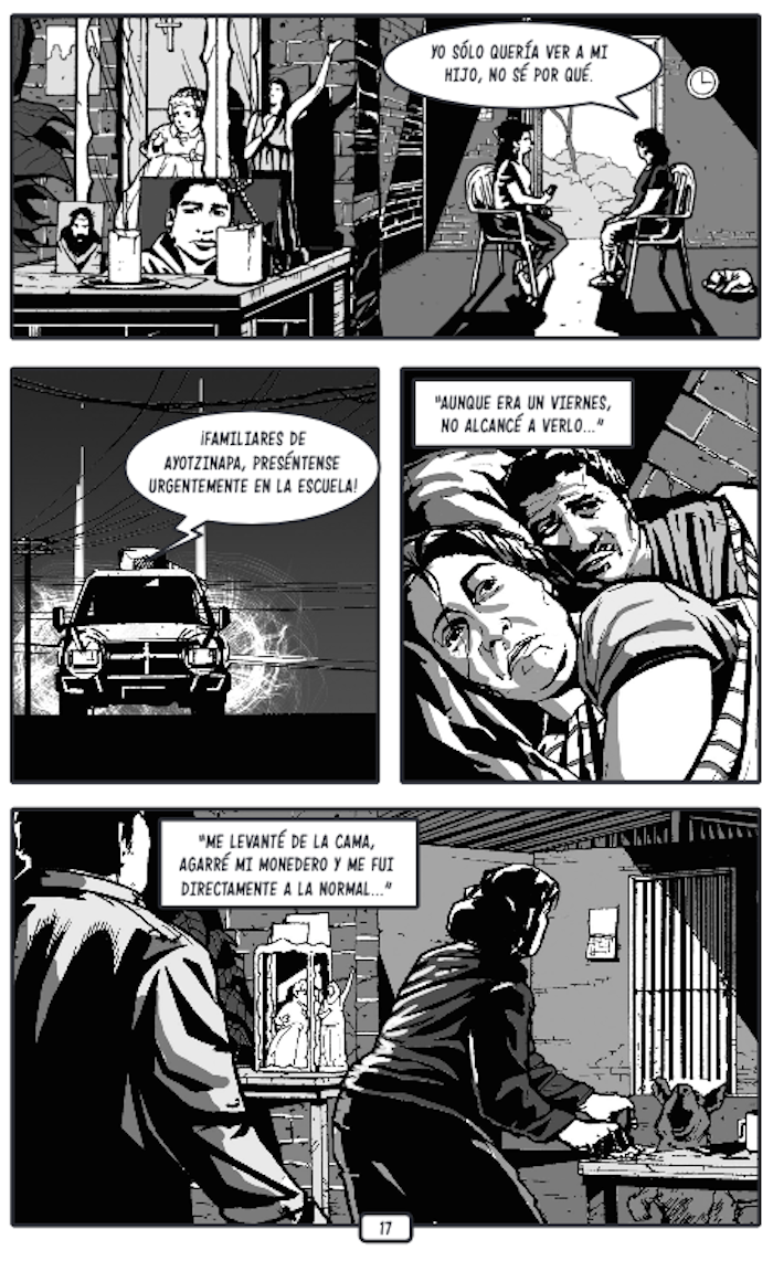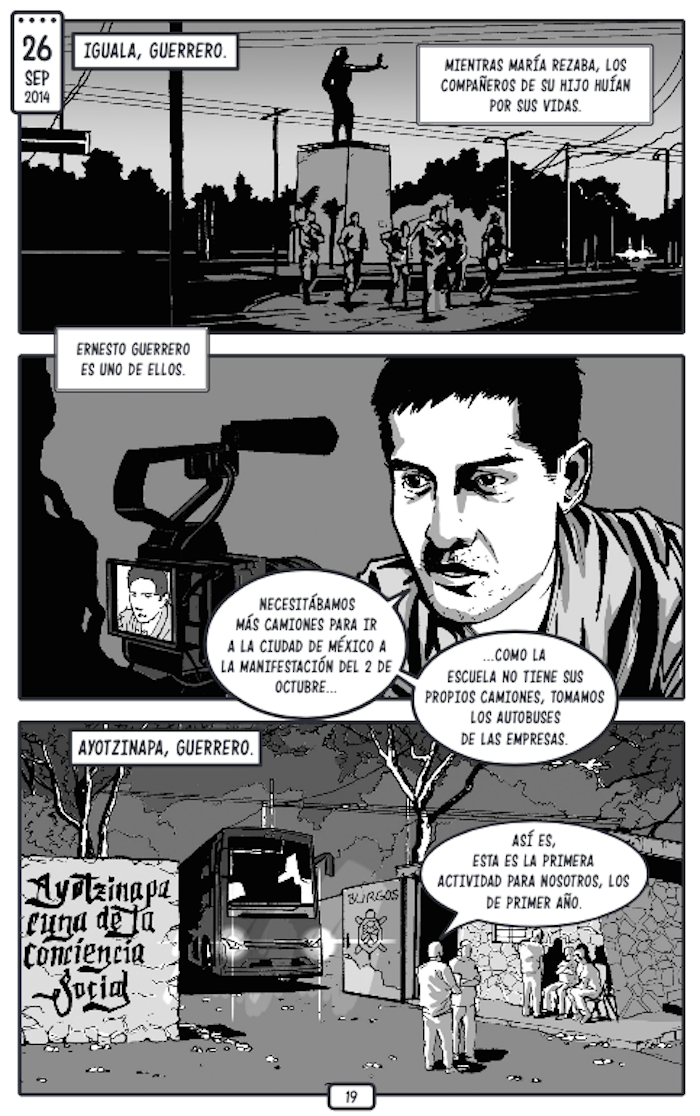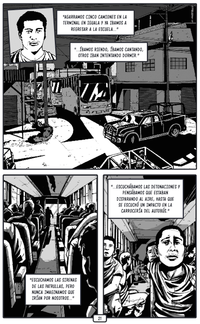 Estas páginas ilustradas narran la desaparición masiva desde las entrañas de Guerrero, las historias de los estudiantes que esquivaron los disparos en los ataques y la angustia de familiares y amigos que abandonaron sus casas y trabajos para dedicar sus días a buscarlos.