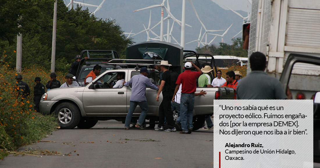 El 10 de febrero, por ejemplo, Edgar Martín Regalado, integrante del Colectivo en Defensa de los Derechos Humanos y de los Bienes Comunales de Unión Hidalgo, fue víctima de un atentado con arma de fuego desde un vehículo en movimiento cuando se trasladaba en un mototaxi rumbo a su casa, horas después de participar en una rueda de prensa en la ciudad de Oaxaca sobre la construcción de este proyecto energético.