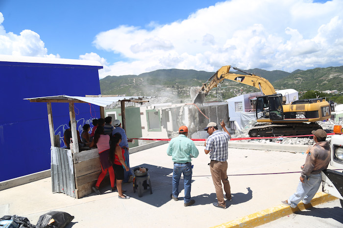 A las 12:47 del día comenzó la demolición, la zona no se acordonó ni se colocó protección, tampoco se habilitó el refugio temporal para las familias que están en la manzana 1B, como prometieron la encargada de la delegación de la Sedatu, Alma Aurora Jiménez; el secretario de Protección Civil estatal, Marco César Mayares Salvador; y el secretario de Desarrollo Social, Mario Moreno Arcos.