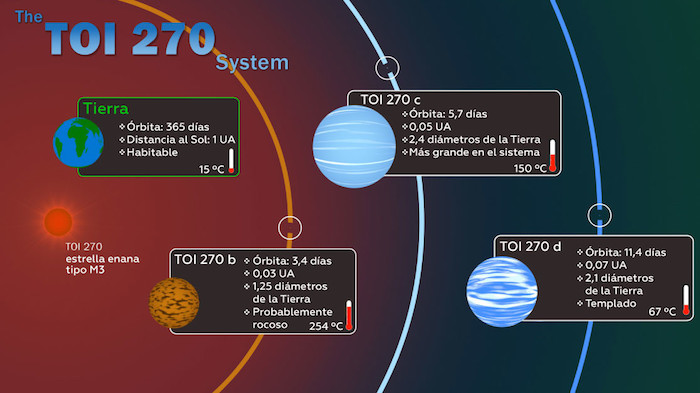 Por otra parte, debido a la probable presencia de una densa atmósfera capaz de retener el calor, la vida en TOI 270 d solo sería posible en sus capas más altas.