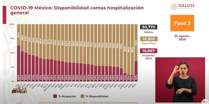 Con respecto a la ocupación de camas generales, la media nacional se ubica en 35 por ciento; de las 30 mil 770 disponibles, 10 mil 867 están ocupadas.