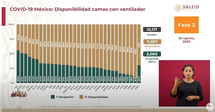 En cuanto a las camas con ventilador, la media nacional es del 30 por ciento. De los 10 mil 117 espacios disponibles, 3 mil 060 están ocupados.