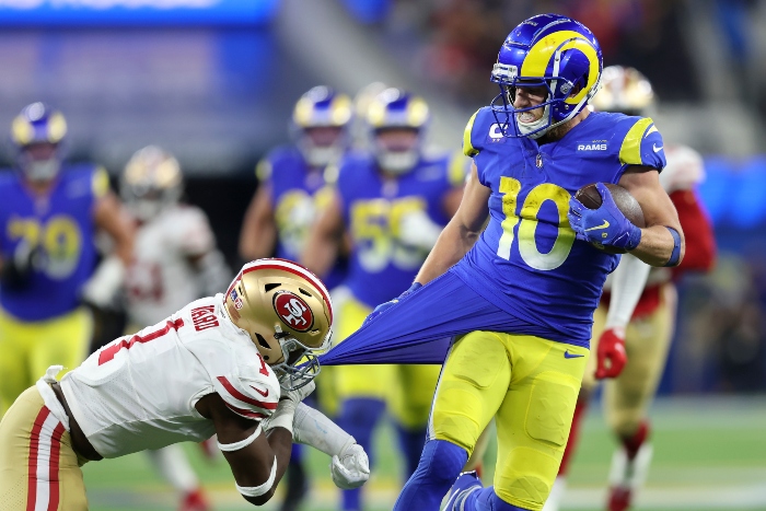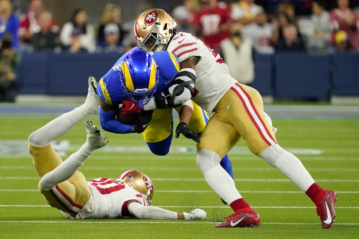 Jimmie Ward, de los 49ers de San Francisco, intenta detener a Cooper Kupp, de los Rams de Los Ángeles, en la segunda mitad de la Final de la Conferencia Nacional, el domingo 30 de enero de 2022, en Inglewood, California. Foto: Jed Jacobsohn, AP.