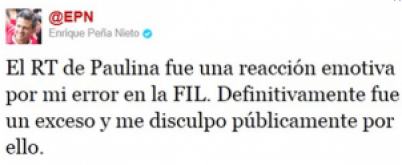A las 00:38 horas, la cuenta de Paulina, @Pau_95Pena, retuiteó una publicación de su novio, @JojoTorre, en la cual trató de defender al ex gobernador del Estado de México tras las críticas luego de su participación en la FIL.