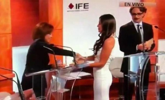 Mayo 6, 2012: Mientras los candidatos discutían y presentaban propuestas durante el primer debate presidencial, en las redes sociales circulaban decenas de Memes y fotografías del personaje que para muchos ganó el encuentro: la edecán y playmate Julia Orayen. Con su prominente escote y tan sólo 30 segundos de participación, la argentina se robó la noche y obtuvo fama internacional, opacando incluso la participación de los presidenciables. Al ser entrevistada sobre su atuendo, la joven reveló que ella lo eligió y aseveró: “No creí que el escote desatara un escándalo”. Uno de los más cautivados con el provocativo vestido fue el abanderado del Panal, Gabriel Quadri, quien un día después expresó que la presencia de la también modelo lo puso “nervioso”.