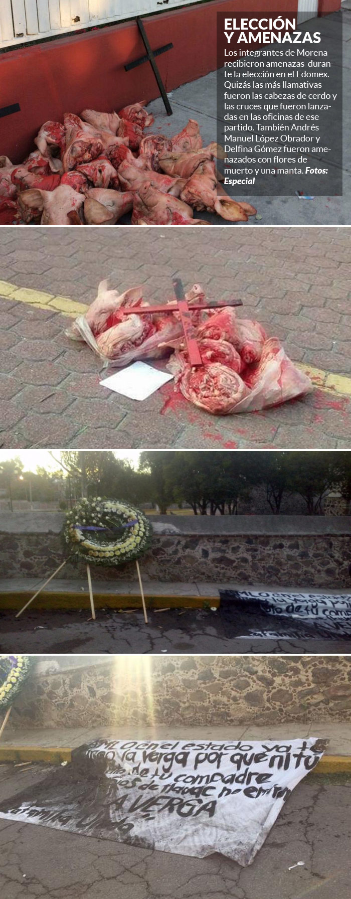 Un días antes a la elección individuos abandonaron cabezas de cerdo ensangrentadas y cruces a las puertas de la sedes de Morena en Tlanepantla e Ixtapaluca. A ello se sumó, el secuestro de dos líderes de ese mismo partido en Atlacomulco y Metepec.