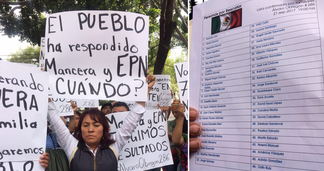 Ciudad de México, 23 de septiembre (SinEmbargo).- “¿En dónde está Mancera? ¿En dónde está Peña? Nosotros queremos a nuestras familias ya. Sáquenlos con nuestro dinero”, señala la madre de una mujer que está adentro del edificio 286 de Álvaro Obregón.