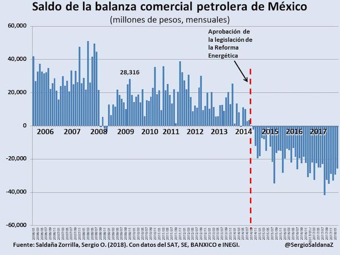 En 2017, el déficit comercial petrolero fue equivalente al 99% del déficit comercial de toda la economía mexicana (350 y 354 mil millones de pesos, respectivamente). Como se observa en la siguiente Gráfica, hasta agosto de 2014, mes en el que se consuma la aprobación del paquete de leyes de la reforma energética, teníamos un marcado superávit en nuestra balanza comercial petrolera (que es el resultado de las exportaciones menos las importaciones de petróleo, gas, petroquímica y derivados). Sin embargo, a partir de que entra en vigor la reforma energética, nuestro superávit petrolero se ha convertido en déficit hasta ahora.