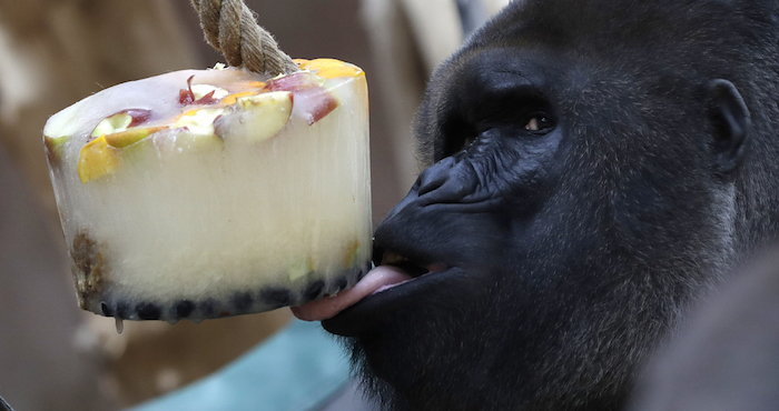 Los cuidadores de los gorilas que habitan en el zoológico de Praga les sirven sorbetes y agua congelada con fruta para que se refresquen durante la ola de calor que azota Europa. El cuidador Vit Lukas dijo que el zoológico generalmente limita las frutas con alto contenido de azúcar tales como bananas y uvas, para evitar que los gorilas se vuelvan obesos.
